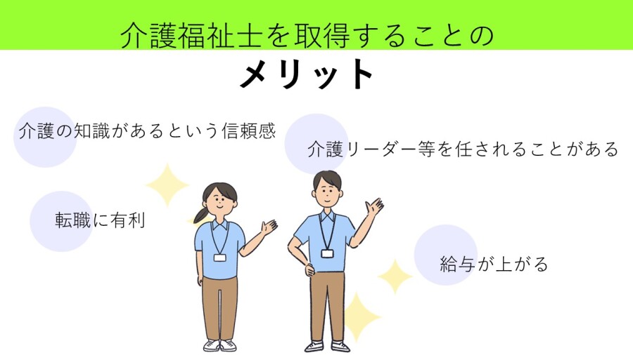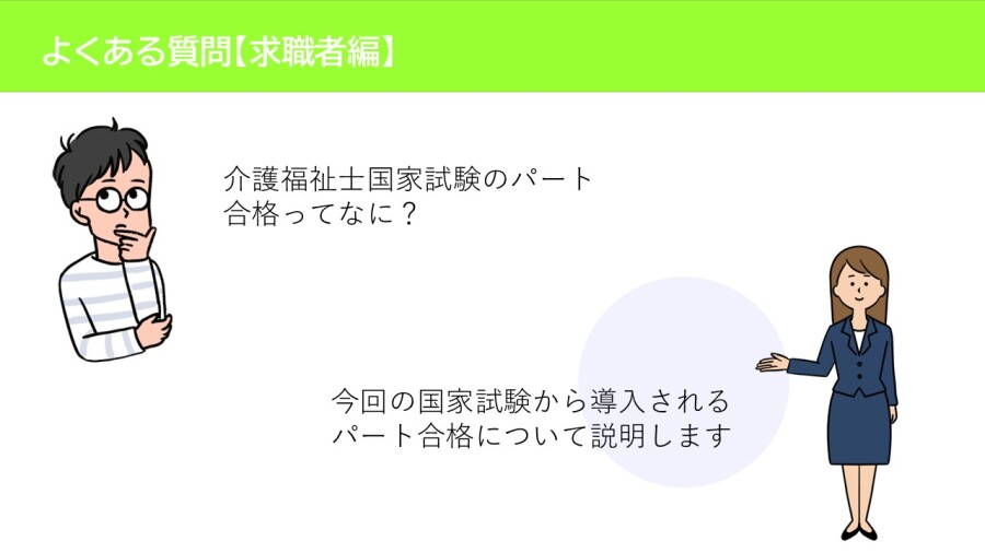 介護福祉士国家試験パート合格とは 今年の1月25日(日)におこなわれる介護福祉士国家試験。 今回の試験から、複数の科目を1つのパートとして合否判定するパート合格が導入されます。 介護福祉士の概要とパート合格について説明をしていきます。 【介護福祉士とは】 「介護福祉士」とは、社会福祉士及び介護福祉士法の2条に下記のように規定されています。 第2条第2項(介護福祉士の定義) 専門的知識及び技術をもつて、身体上又は精神上の障害があることにより日常生活を営むのに支障がある者につき心身の状況に応じた介護(喀痰かくたん吸引その他のその者が日常生活を営むのに必要な行為であって、医師の指示の下に行われるものを含む。)を行い、並びにその者及びその介護者に対して介護に関する指導を行うことを業とする者 介護福祉士資格は、介護に係る一定の知識や技能を習得していることを証明する唯一の国家資格です。 介護の名が付く資格がたくさんありますが、介護福祉の専門職である介護福祉士が唯一の国家資格です。 【介護福祉士の取得方法】 介護福祉士を取得しようと考える際に、受験資格があるか確認が必要です。福祉系の学校を卒業していなくても実務経験を積むことで介護福祉士の国家試験に挑戦することができます。 [介護福祉士国家試験]受験資格:福祉系大学等:公益財団法人 社会福祉振興・試験センター 【介護福祉士の試験概要】 介護福祉士の国家試験は年1回、全国35の地域で例年1月頃実施されます。 試験科目は以下の通りになります。 4領域12科目及び総合問題1科目の計13科目 ・出題数は、125問 ・出題形式は五肢択一を基本とする多肢選択形式です。 第38回介護福祉士国家試験『受験の手引』(一部抜粋版) 【介護福祉士国家試験パート合格とは】 今までの介護福祉士国家試験の合格基準は、「すべての科目群で得点があること・60%程度を基準としたその年の基準点を満たした者」でした。 それが今年度の試験から以下の点が変更になります。 パート合格(合格パートの受験免除)は、複数の科目を1つのパートとして合否判定します。 試験科目を3パートに分割し、一定の合格基準に達したパートについて、翌年、翌々年まで合格したパートの受験が免除されます [介護福祉士国家試験]パート合格(合格パートの受験免除)がスタートします!:公益財団法人 社会福祉振興・試験センター 【介護福祉士を取得することのメリット】 介護福祉士の資格に更新は無いため、一度国家試験に合格し登録すればどこへ行っても介護福祉士を名乗ることができます。 今年度の介護福祉士国家試験から導入されるパート合格。 3年間の猶予があることで受験へのハードルが少し下がったのではないでしょうか。 資格やスキルアップ等についてのご相談がありましたらいつでも新潟県福祉人材センターへご相談ください。 介護福祉士とは | 日本介護福祉士会 [介護福祉士国家試験]資格制度の概要:公益財団法人 社会福祉振興・試験センター 一覧へ戻る