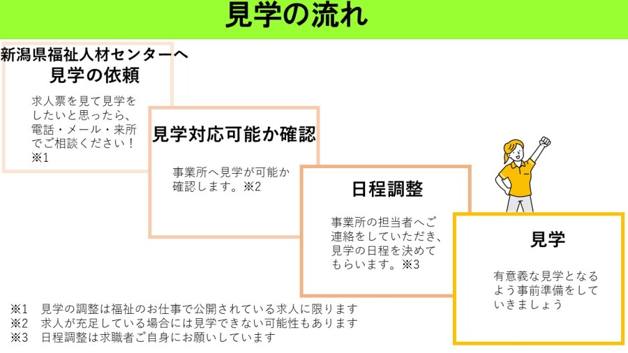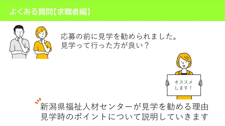 新潟県福祉人材センターでは、応募前に見学を勧めることが多くあります。