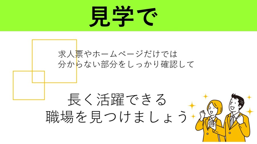 求人票やHPでは分からない、雰囲気や働く人の様子を見たり求人票に載っていないことを直接聞くことができる!