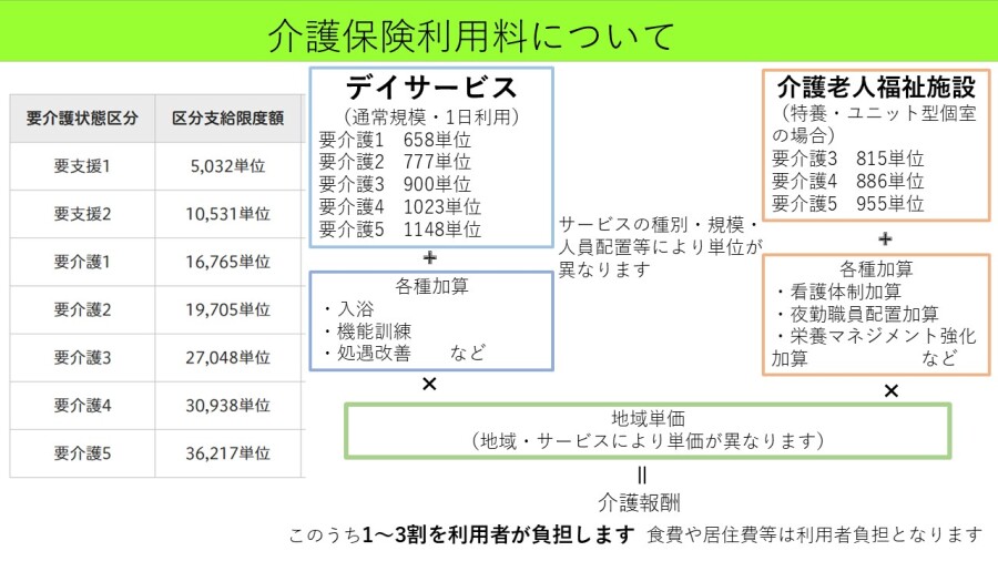 介護サービス事業所が介護保険のサービスを提供すると、介護度や提供時間、提供事業所の体制に応じて単位数が決められています。