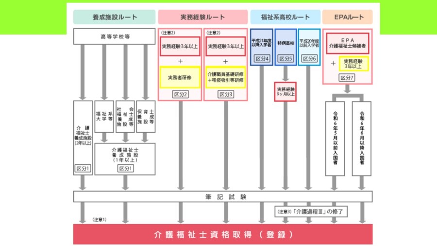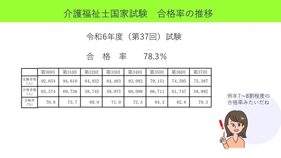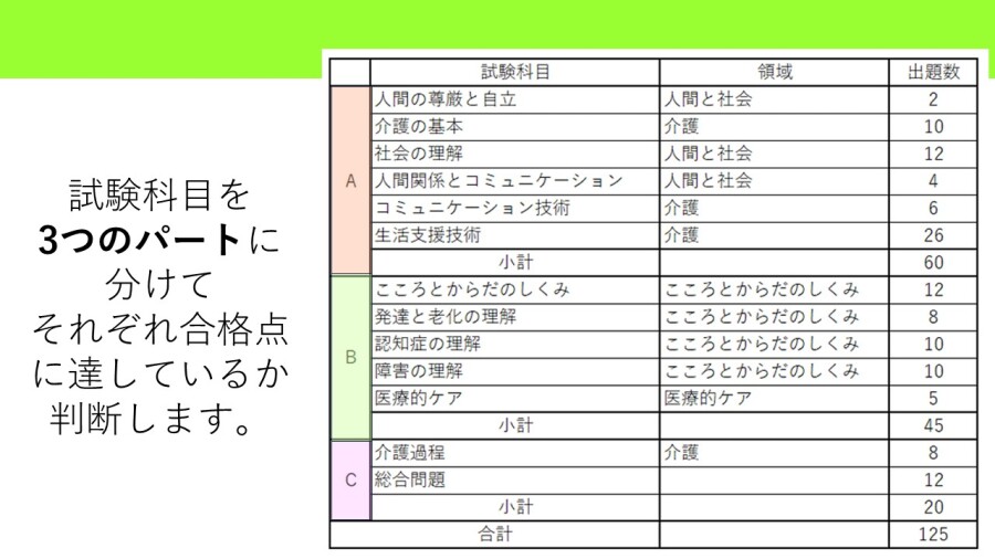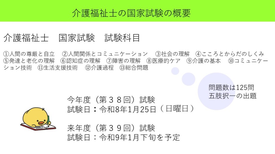 介護福祉士国家試験パート合格とは 今年の1月25日(日)におこなわれる介護福祉士国家試験。 今回の試験から、複数の科目を1つのパートとして合否判定するパート合格が導入されます。 介護福祉士の概要とパート合格について説明をしていきます。 【介護福祉士とは】 「介護福祉士」とは、社会福祉士及び介護福祉士法の2条に下記のように規定されています。 第2条第2項(介護福祉士の定義) 専門的知識及び技術をもつて、身体上又は精神上の障害があることにより日常生活を営むのに支障がある者につき心身の状況に応じた介護(喀痰かくたん吸引その他のその者が日常生活を営むのに必要な行為であって、医師の指示の下に行われるものを含む。)を行い、並びにその者及びその介護者に対して介護に関する指導を行うことを業とする者 介護福祉士資格は、介護に係る一定の知識や技能を習得していることを証明する唯一の国家資格です。 介護の名が付く資格がたくさんありますが、介護福祉の専門職である介護福祉士が唯一の国家資格です。 【介護福祉士の取得方法】 介護福祉士を取得しようと考える際に、受験資格があるか確認が必要です。福祉系の学校を卒業していなくても実務経験を積むことで介護福祉士の国家試験に挑戦することができます。 [介護福祉士国家試験]受験資格:福祉系大学等:公益財団法人 社会福祉振興・試験センター 【介護福祉士の試験概要】 介護福祉士の国家試験は年1回、全国35の地域で例年1月頃実施されます。 試験科目は以下の通りになります。 4領域12科目及び総合問題1科目の計13科目 ・出題数は、125問 ・出題形式は五肢択一を基本とする多肢選択形式です。 第38回介護福祉士国家試験『受験の手引』(一部抜粋版) 【介護福祉士国家試験パート合格とは】 今までの介護福祉士国家試験の合格基準は、「すべての科目群で得点があること・60%程度を基準としたその年の基準点を満たした者」でした。 それが今年度の試験から以下の点が変更になります。 パート合格(合格パートの受験免除)は、複数の科目を1つのパートとして合否判定します。 試験科目を3パートに分割し、一定の合格基準に達したパートについて、翌年、翌々年まで合格したパートの受験が免除されます [介護福祉士国家試験]パート合格(合格パートの受験免除)がスタートします!:公益財団法人 社会福祉振興・試験センター 【介護福祉士を取得することのメリット】 介護福祉士の資格に更新は無いため、一度国家試験に合格し登録すればどこへ行っても介護福祉士を名乗ることができます。 今年度の介護福祉士国家試験から導入されるパート合格。 3年間の猶予があることで受験へのハードルが少し下がったのではないでしょうか。 資格やスキルアップ等についてのご相談がありましたらいつでも新潟県福祉人材センターへご相談ください。 介護福祉士とは | 日本介護福祉士会 [介護福祉士国家試験]資格制度の概要:公益財団法人 社会福祉振興・試験センター 一覧へ戻る