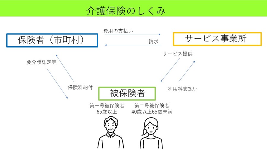 市区町村(保険者)が運営し、 40歳以上の方(被保険者)が加入し、加入者全員が保険料を納めます。介護が必要になったときに訪問介護(ホームヘルプ)、通所介護(デイサービス)などのサービスが利用できます。