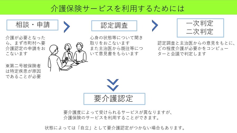 40歳以上の方から被保険者として介護保険の対象となっていますが、介護保険のサービスを利用するためには「要介護認定」を受ける必要があります。