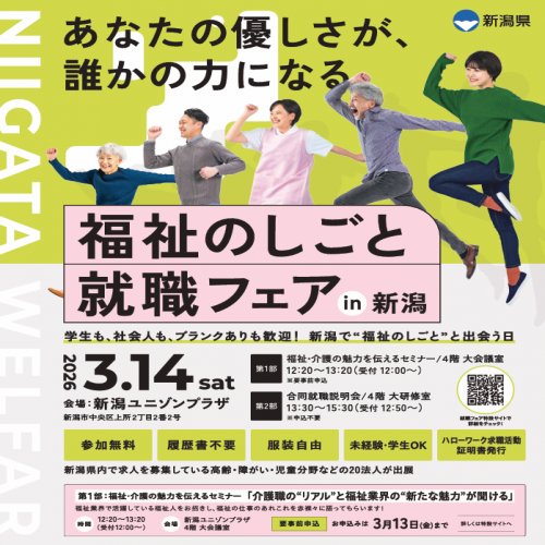 2026.02.19 福祉のしごとへの第一歩!3/14福祉のしごと就職フェア開催します 2026.02.18 介護分野で働く方に知っておいてほしい、介護保険の話 2026.01.8 春に向けて早めのスタート!2/7福祉のしごと就職フェア開催します 2025.12.18 学生の皆様!介護施設でアルバイトをしてみませんか? 2025.11.20 【よくある質問】福祉の職場では、どんな職種や資格を持った人が働いている? 2025.10.16 【よくある質問】確認しましたか?最低賃金、改正しました! 2025.10.1 《フェア開催報告》9月27日(土) 福祉のしごと就職フェアin新潟 2025.09.18 【よくある質問】見学って行った方が良いの? 2025.08.26 新潟市内の事業所限定☆福祉のしごと就職フェアin新潟 2025.08.21 【よくある質問】求人票の見方 2025.07.17 親子で介護体験☆夏休みに介護を知ろう!学ぼう!体験しよう! 2025.06.24 《福祉のしごと就職フェア開催報告》6月8日(日)長岡 6月21日(土)上越 2025.06.19 【よくある質問】 福祉人材センターってなに? 2025.05.22 就職フェアがあなたの地元で!長岡・上越で開催します! 2025.05.21 《フェア開催報告》令和7年5月18日(日) 福祉のしごと就職フェアin新潟